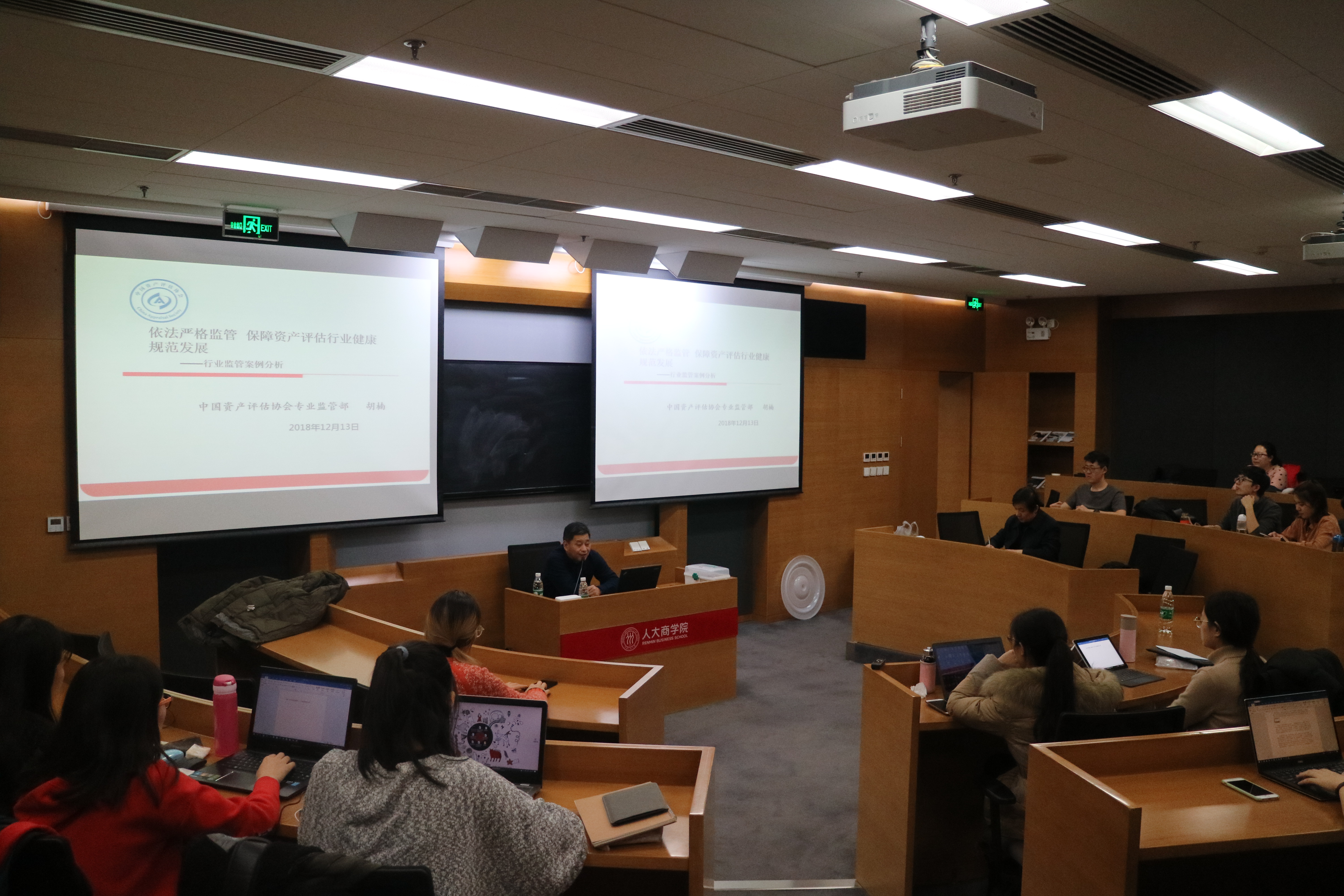 2018年12月13日晚,中国资产评估协会专业监管部主任胡楠应邀走进人大“MV实务讲堂”,讲座主题是“依法严格监管,保障资产评估行业健康规范发展——行业监管案例分析”。2017级、2018级资产评估专业硕士参加了这次活动。讲座在明德商学楼4层报告厅举行,yl23411永利MV项目俞明轩主任主持这次讲座。