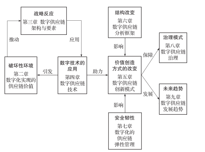 《数字供应链》共十个章节。第一章解构了数字化和数字化转型的内涵,第二章阐述了数字化能够实现的供应链价值,第三章介绍了数字供应链架构与要素,第四、五、六章分别探讨了数字供应链技术、创新模式以及分析框架,第七、八章分别阐明了数字化的供应链韧性管理和数字供应链治理,最后一章则探索了数字供应链的发展趋势。