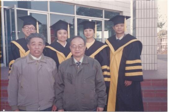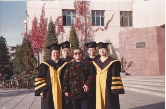我毕业后虽然留在外经所任教,在合并为工商管理公司之前,未能与工经系老师有工作上的往来。虽然没有机会直接在李老师领导下工作,但是碰到问题、烦恼或高兴的事,我总会时不时地到老师家讨教、倾述。在生活上,弟子还得到了导师和师母的许许多多的述之不完的关爱与启迪。刚好在我们第三届博士生论文答辩完成后一年,公司开始举行正式的学位授予仪式。我们这一届同窗学子穿着博士服,在一组与两位正、副导师合影的具有独特纪念性意义的照片外,还有一张对我个人来说显示出师母对我们特别关怀的合影(照片6)。