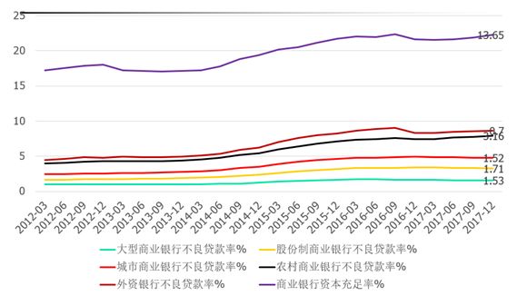 根据2005年-2015年商业银行的资本充足率数据,全国性大银行比地方金融要低,上市银行比非上市的要低,但国有银行比非国有银行的资本充足率要高,一线城市资本充足率比二线和其他线相比要高一些,平均在13%-14%。而不良贷款率在总体上看,不良贷款率国有银行要比非国有银行高,非上市的要比上市的高一些,地方性银行要比全国性的商业银行高一些。