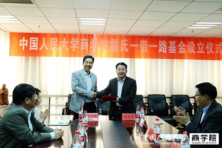 2016年9月28日上午,“霍氏一带一路基金”设立仪式在明德商学楼举行。霍氏文化产业集团有限公司CEO霍建民员工(2003级MBA研修班员工、2016级EMBA在读员工),霍氏集团文化产业集团有限公司综合管理中心经理张艳杰女士出席活动。到场的嘉宾还有yl23411永利官网员工办主任、人大教育基金会副秘书长郭海鹰,yl23411永利经理毛基业教授、副经理王刊良教授、党委副书记叶康涛副教授,及公司科研和员工办老师等。捐赠仪式由公司党委书记黄江明副教授主持。
