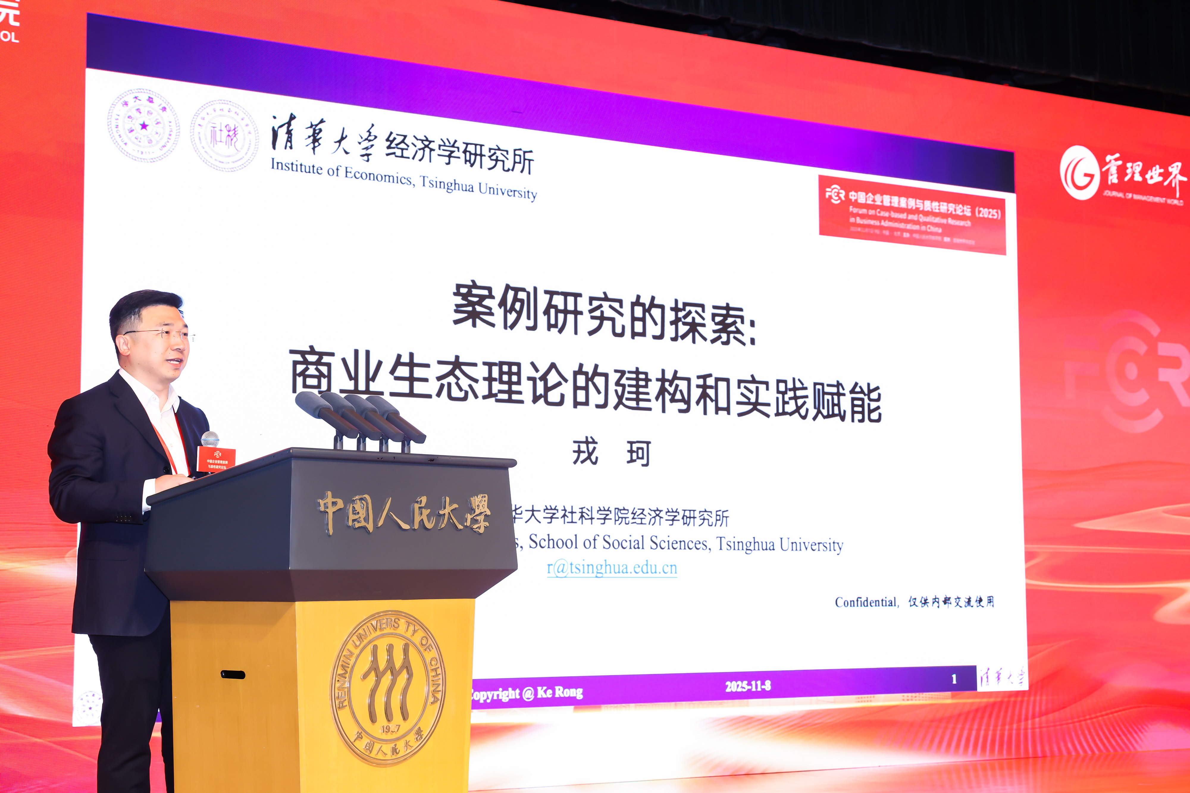 戎珂作题为“案例研究的探索:商业生态的建构与实践赋能”的主题报告。他结合华为、美团等案例,以系统化的原创“6c理论”,揭示了商业生态的理论建构过程与实践落地,并探讨了在数智时代背景下商业生态理论的拓展研究方向,包括平台生态、数据生态与AI生态,以及相关生态建设如何反哺企业战略与创新实践,如何与国家政策形成良性互动与协同等。他表示,案例研究者应成为领域开拓的专家与先锋,以饱满的学术热情和强烈的使命感,积极投身新兴领域的理论创新与实践探索,服务国家战略需求与社会发展大局。