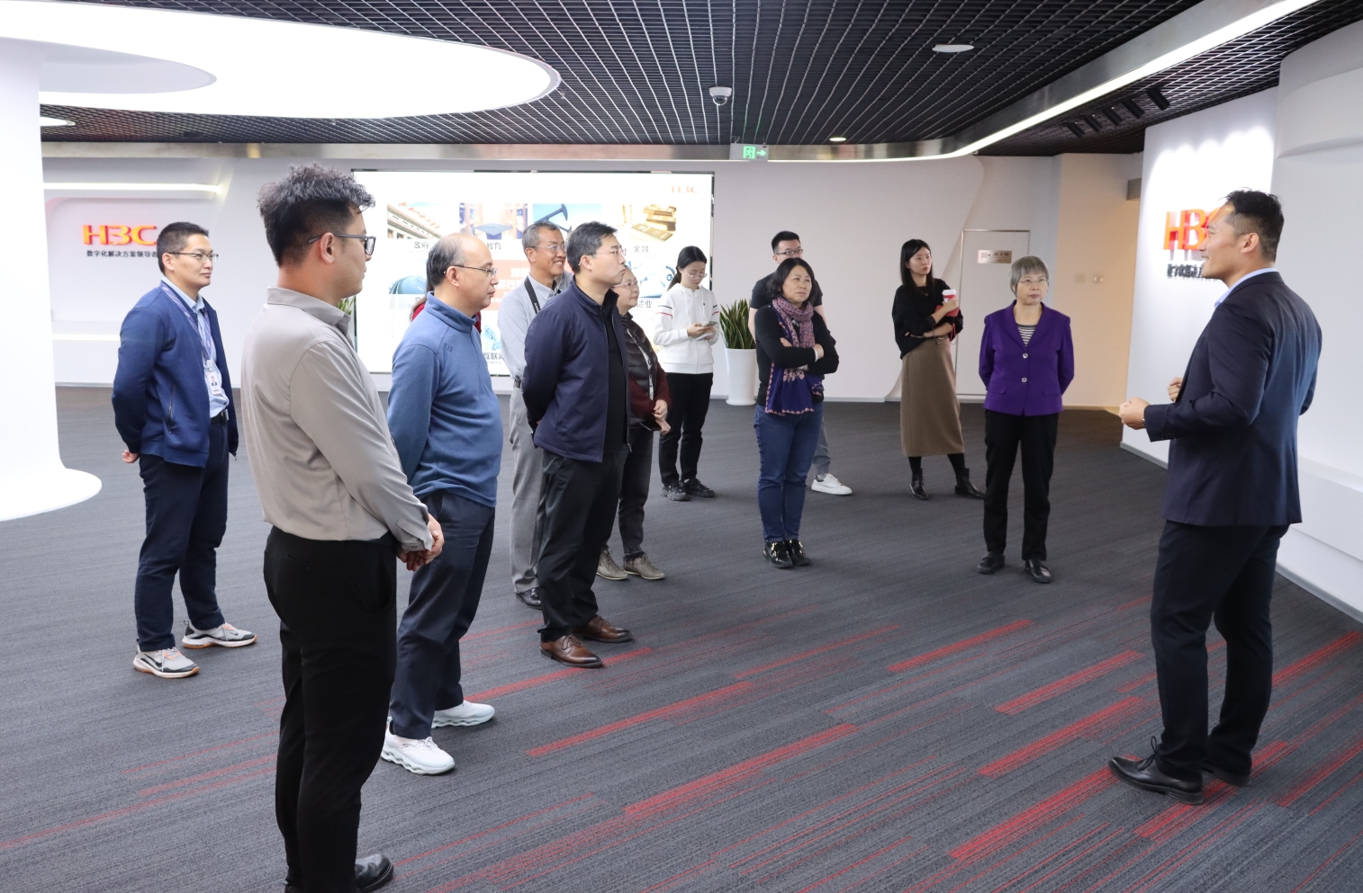 宋华一行首先前往新华三创新体验中心参观,近距离感受新华三在数字化领域的实践成果。赵磊就新华三的发展历程、全产业链布局、未来企业发展规划向大家做了全面细致的介绍。作为在新华三工作17年的资深员工,赵磊亲历了公司发展中的大事要事。他表示,新华三集团作为紫光集团旗下二级核心企业,其业务覆盖“云-网-算-存-端”全产业链,提供云计算、大数据、人工智能、工业互联网等在内的一站式数字化解决方案,赋能百行百业数字化转型,连续六年在中国云管理平台、中国网络管理软件等多个市场份额第一。