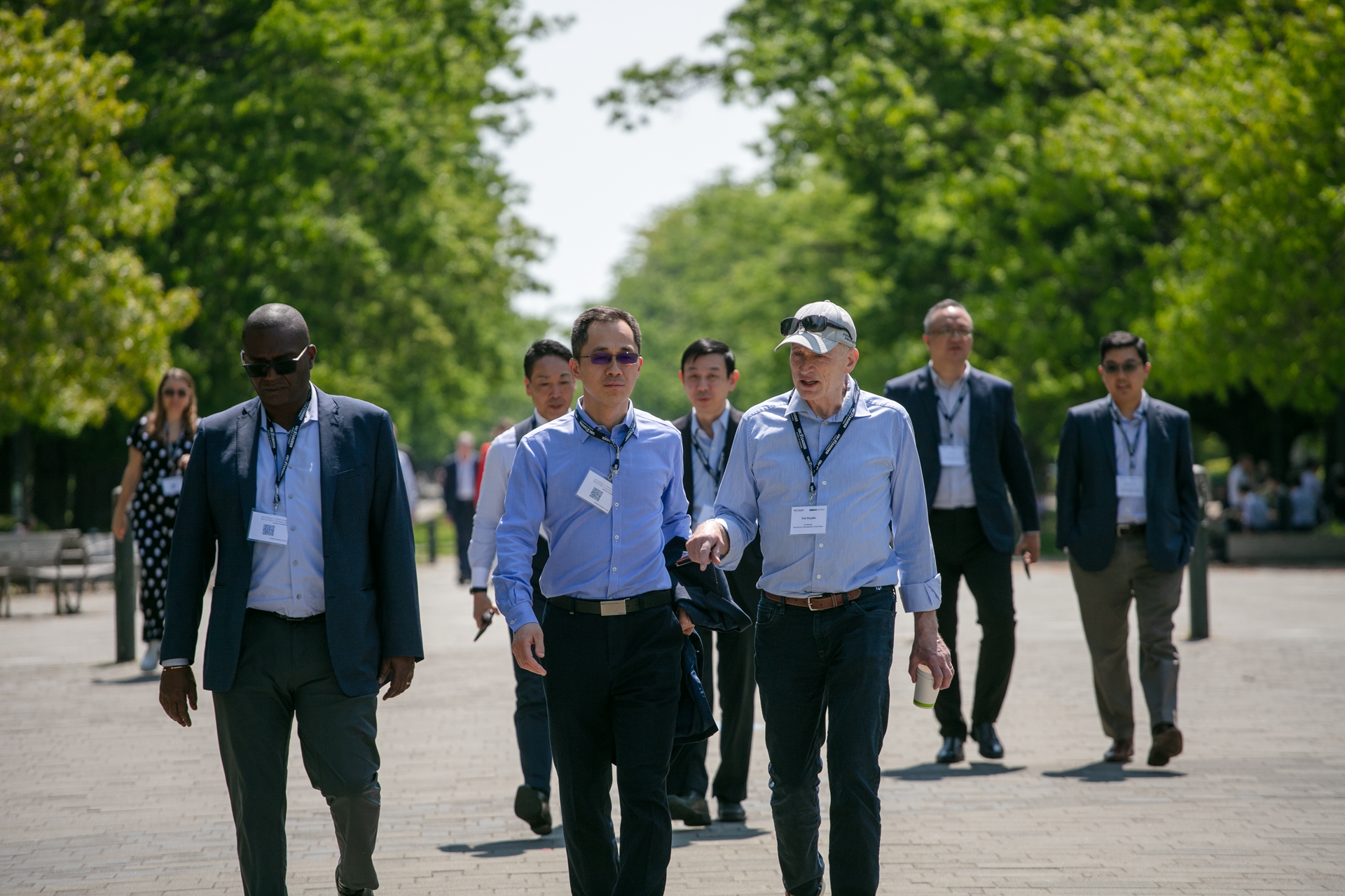 邓子梁与耶鲁大学管理公司现任经理Kerwin Charles(左一)和前任经理Ted Snyder(右一)交谈