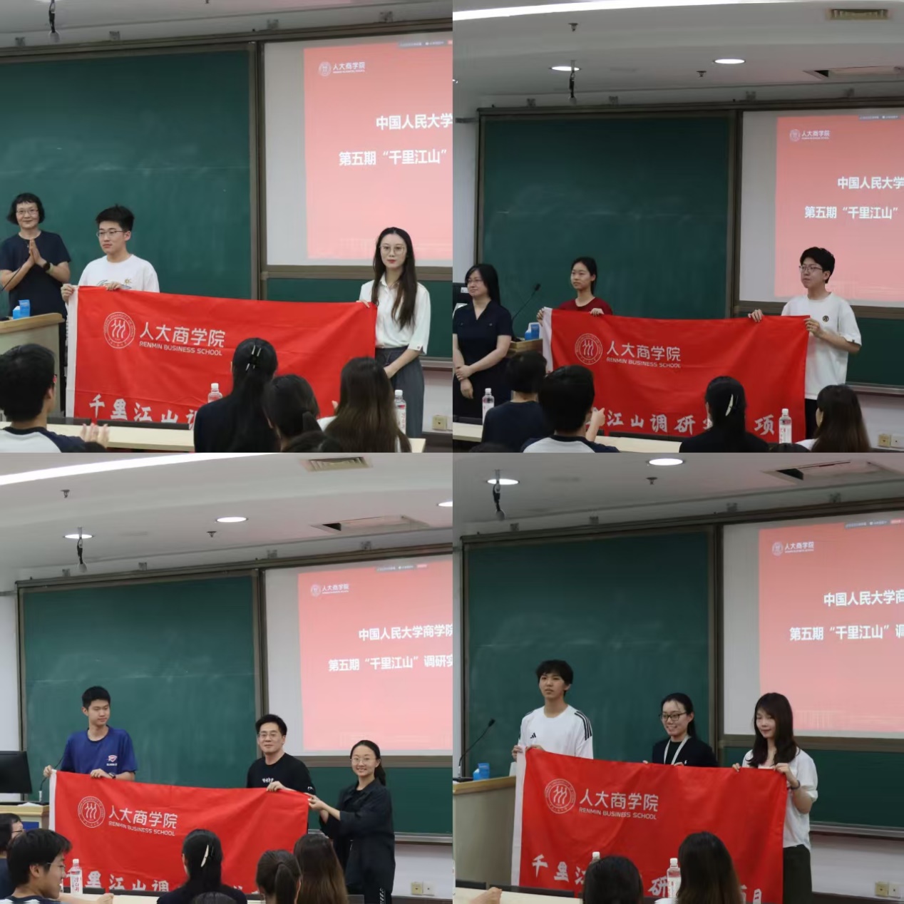 在授旗仪式环节,方玉萍、石明明、吴江华和王慧将“千里江山”旗帜授予新疆、安徽、上海、广东四个团队的员工代表,并勉励同学们带着公司和员工们的嘱托,在实践中成长成才。