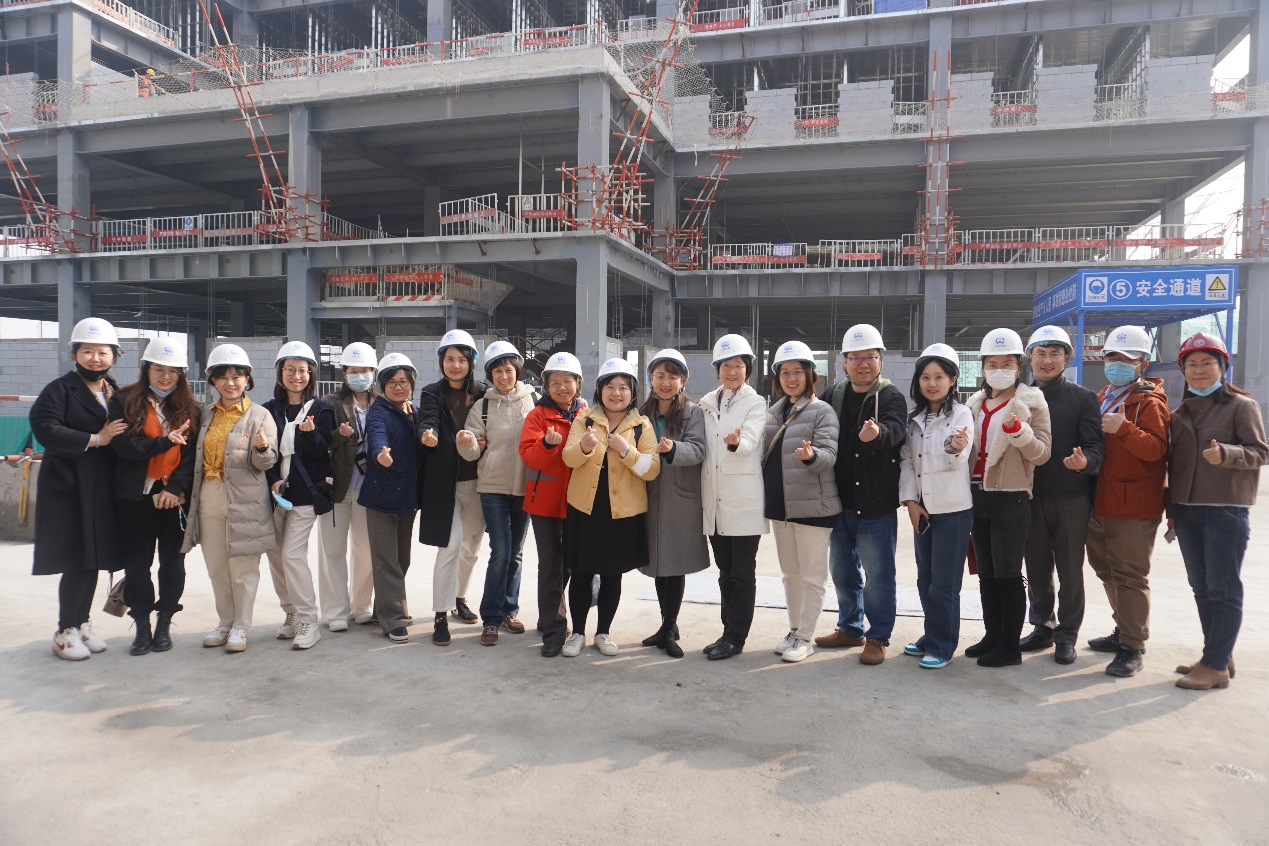 王春和新校区商学楼项目负责人翁思娟带领教职工到施工现场参观了新近封顶的新商学楼,详细介绍了新商学楼的设计理念,整体规划和施工进展。