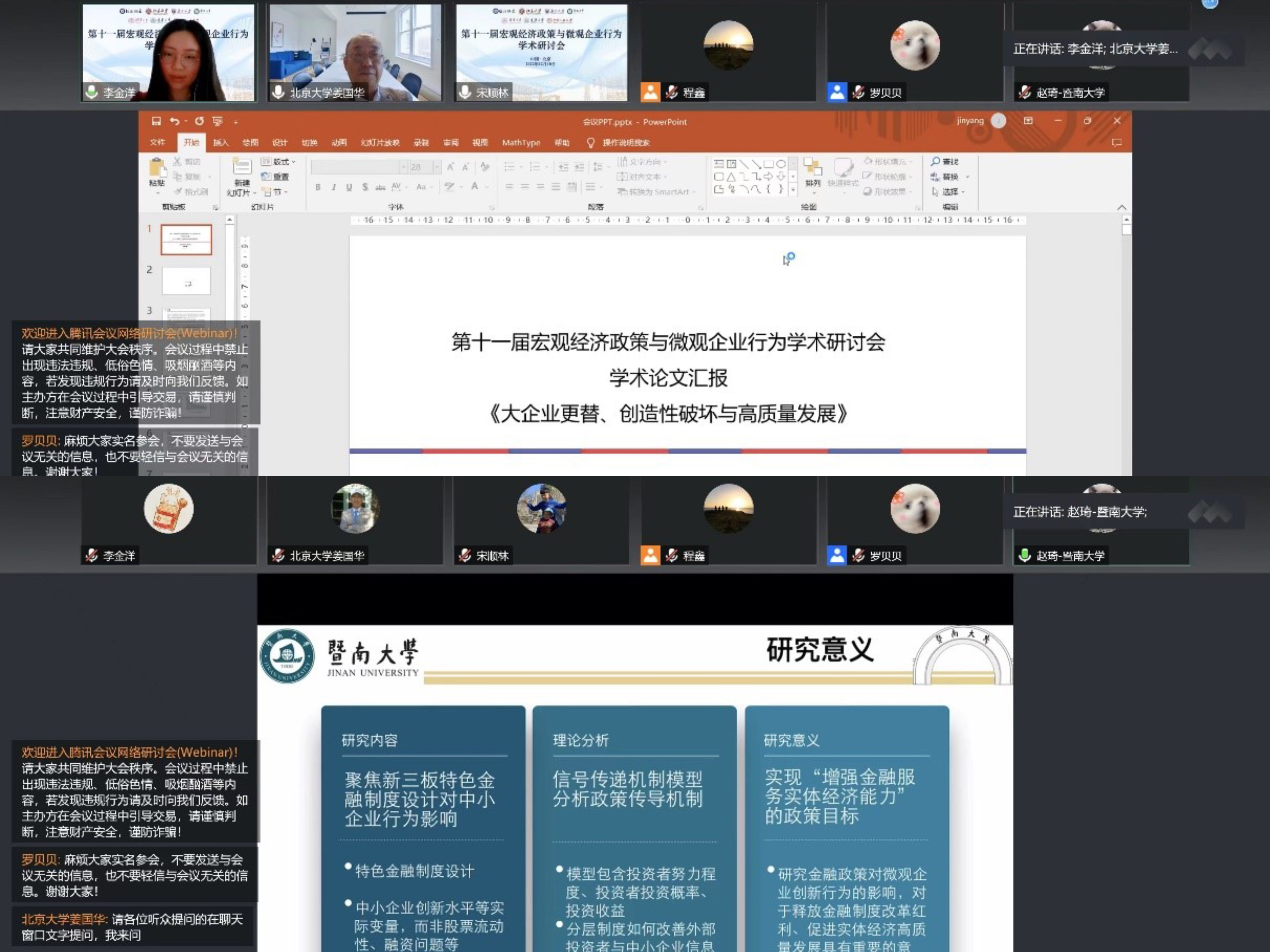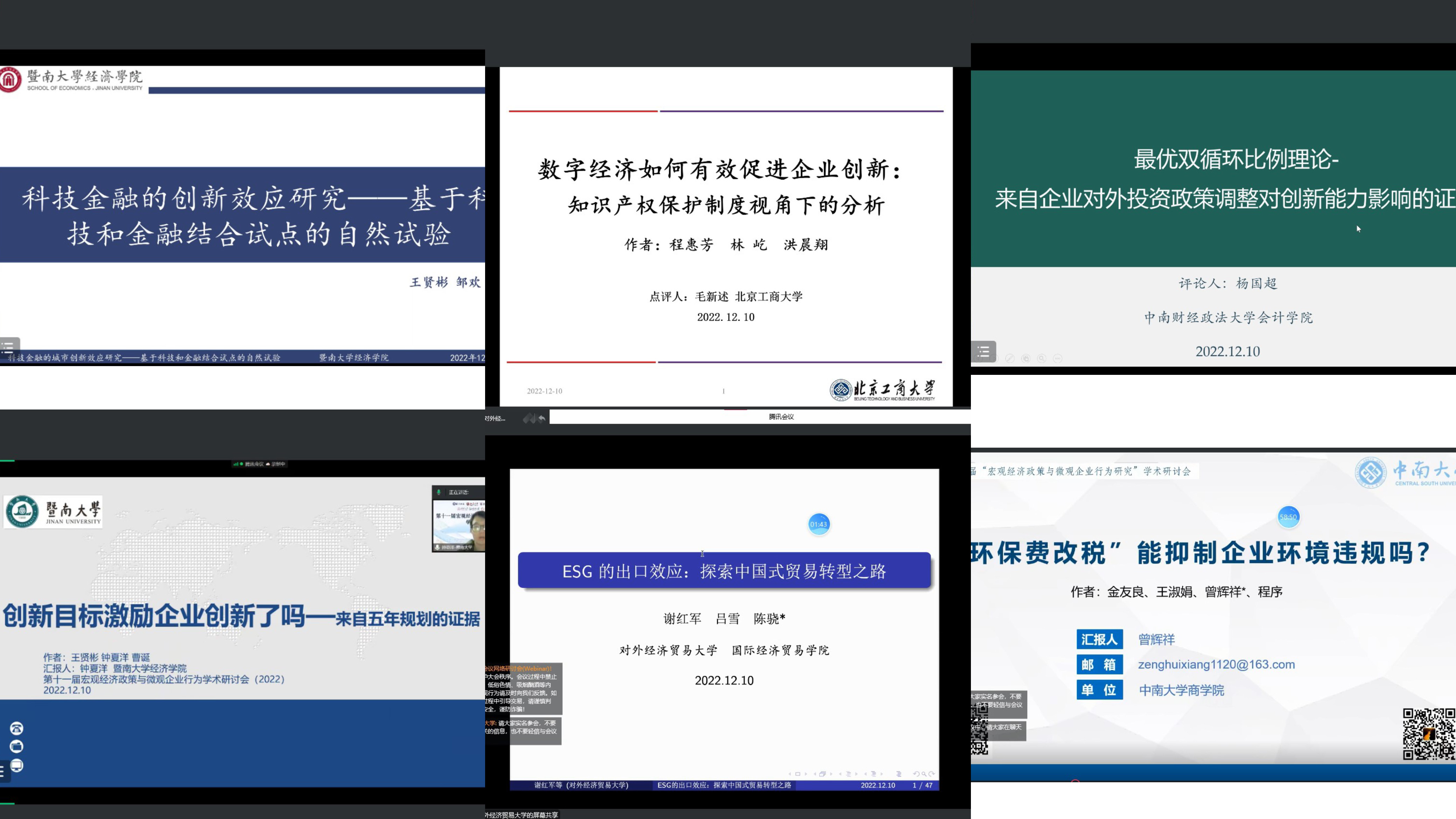 本届会议共设置4个分会场,涵盖企业数字化、环境保护、产业政策、宏观政策、政府管制等多个领域,为与会学者提供了一个思想碰撞、问题辨析和学术交流的平台。来自暨南大学、浙江工业大学、对外经济贸易大学、中南大学、北京大学、西北大学、辽宁大学、中央财经大学、浙江大学、中国社会科公司、中南财经政法大学、武汉大学、厦门大学的16位学者报告了论文,来自中山大学、厦门大学、北京工商大学、北京邮电大学、中南财经政法大学、重庆大学、北京师范大学、浙江工业大学、yl23411永利官网、南京财经大学、中央财经大学、南京大学、北京大学、中国政法大学、浙江财经大学、上海财经大学、山东财经大学、暨南大学、南京审计大学、东北财经大学、南开大学、对外经济贸易大学的32位学者进行了精彩点评。在各分会场中,与会嘉宾和论文作者进行了深入的交流与讨论。