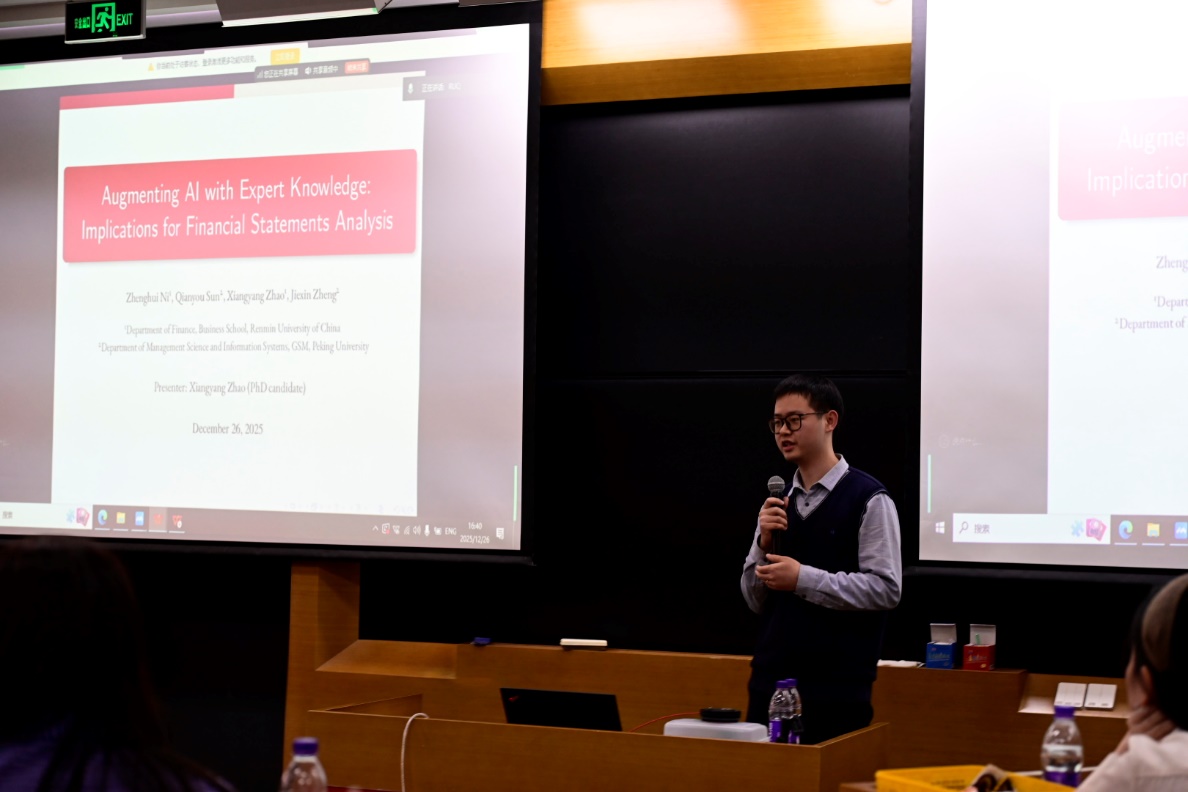 赵向阳作“Augmenting AI with Expert Knowledge: Implications for Financial Statements Analysis”主题报告。文章研究了AI在分析场景中的能力与人类价值的转变。研究发现,大语言模型在复杂金融预测中已经达到人类专家水平,但其与人类的推理逻辑存在差异,未来人类价值将从直接分析转向打磨领域知识以助力机器推理。姜纬对文章的创新性表示了认可,并就文章的研究问题深入性和可能存在的前视偏差等问题提出了建议。