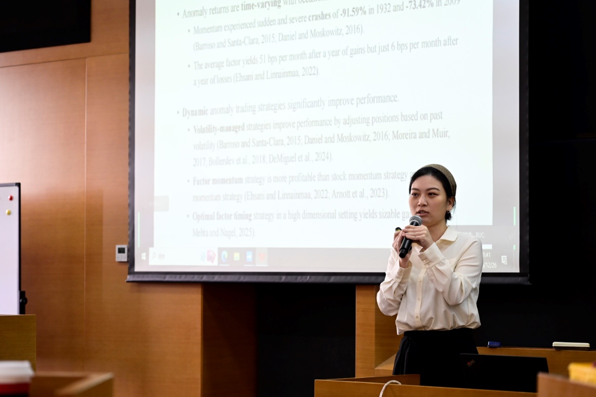 下午的主旨演讲环节,姜纬、财务与金融系副教授任泓霖、博士生赵向阳和姜晓彤分别作主题报告,任泓霖主持。