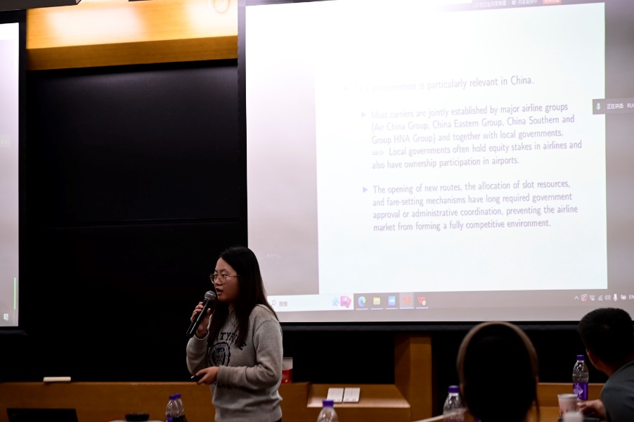 姜晓彤作“Do Airports Favor Their Own? Evidence from Flight Delays”主题报告。文章研究了航空公司从基地机场出发的延误情况,发现从基地机场起飞的航班延误显著更少。这一优势源于本地保护主义,具体通过预留更长的缓冲时间、更灵活的航班取消政策以及更有利的运营安排来实现。姜纬对研究的潜力表示了认可,并对学术报告的表达效果和文章的经济意义分析提出了建议。