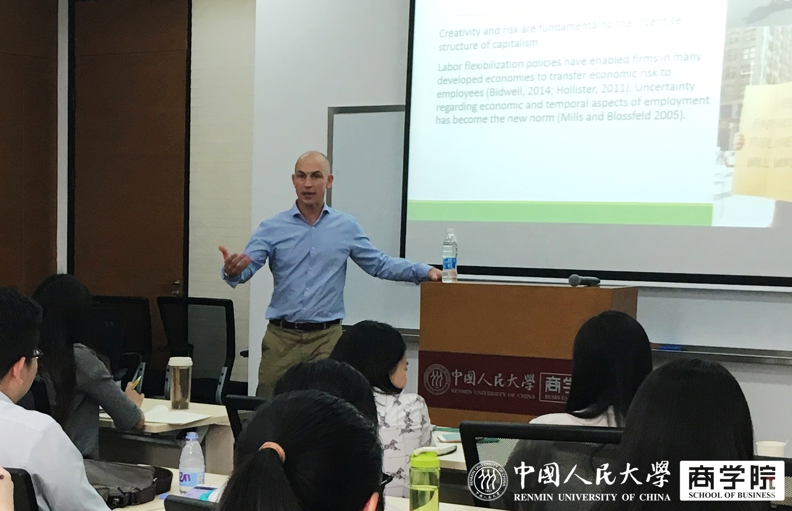 当天下午,Hirst教授还就员工在缺乏安全感和组织支持的情境下如何创新的问题与在场师生展开了热烈探讨。他谈到,在安全感和组织支持缺乏的情境下,员工要想创新则应当寻求一种保护机制,该保护机制可以由员工积极的社会关系网络来提供,身份构建和关系认同是扩大员工社会网络的途径。Hirst教授还指出,在社会网络构建时,网络大小比网络质量(关系强弱)更为重要。在互动环节,参会师生也就此观点展开了热烈的讨论。
