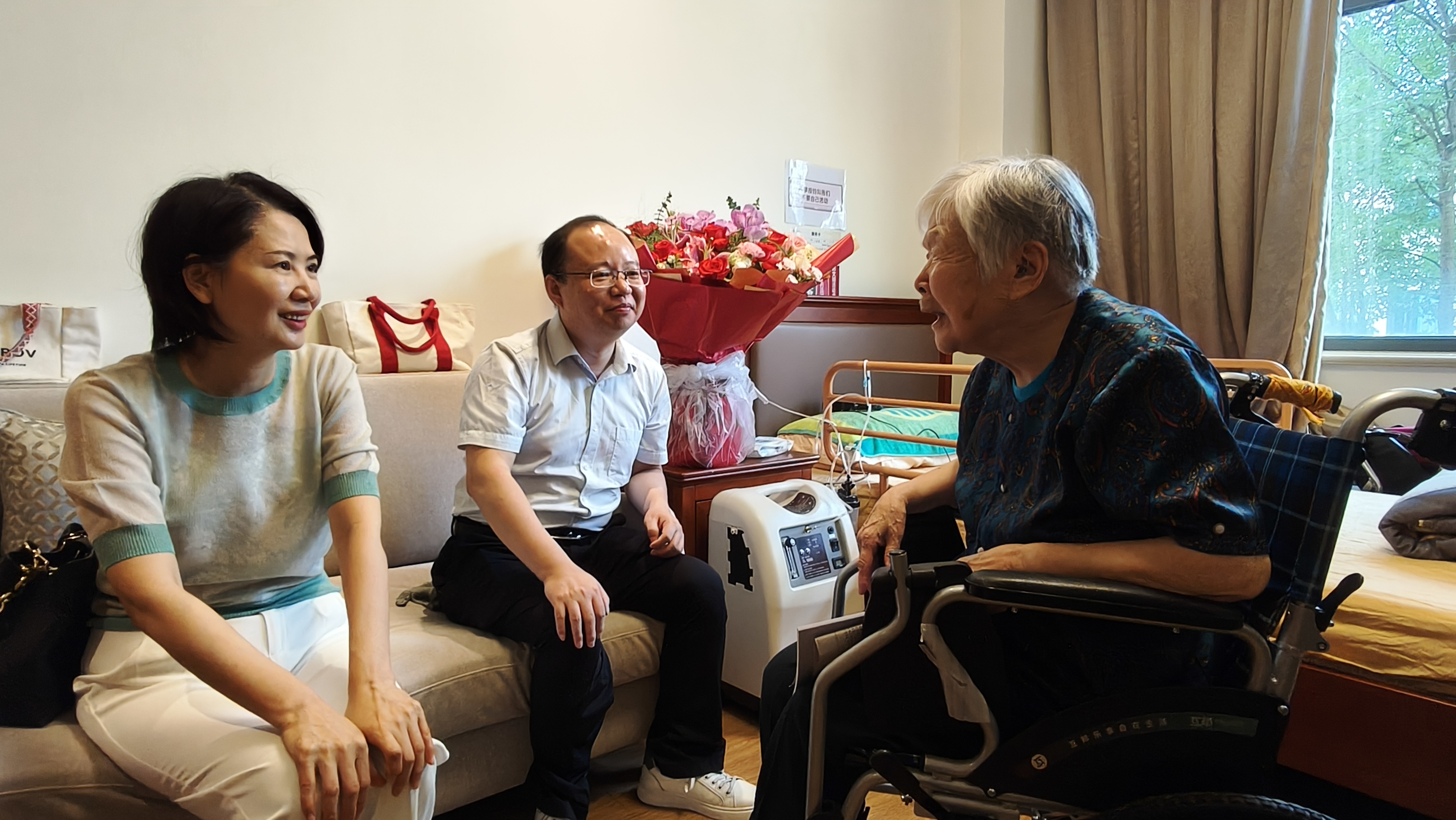 杨海燕、廖冠民与金展晖老师进行了亲切的交谈,详细询问了金老师的身体状况、生活起居,向她表达了崇高的敬意,诚挚祝福她幸福长寿,平安健康。