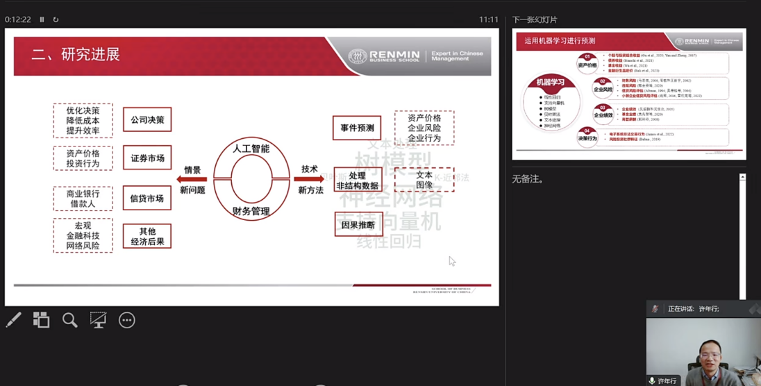 许年行以“人工智能驱动的财务管理研究进展”为题进行分享。他在报告中系统梳理了人工智能技术与财务管理交叉领域的文献分布、研究主题、研究方法,介绍了人工智能新技术、新方法在财务领域新情景、新问题中应用的最新研究进展,并展望了人工智能技术在ESG等研究领域的应用前景。