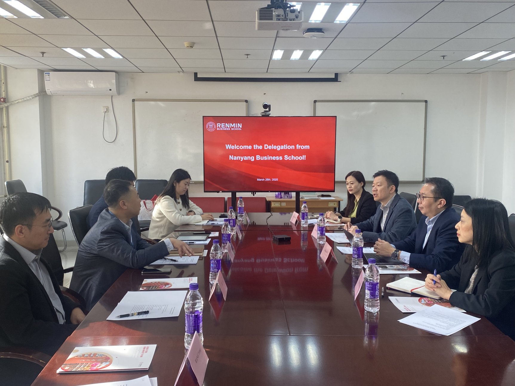 随后,双方围绕MBA双学位项目、员工交换计划及短期游学项目等合作路径展开讨论。赵大旋就课程对接、学分互认等具体问题与对方交换意见。徐图提出未来在博士联合培养领域的合作愿景,希望推动两院在高层次人才培养方面的深度协作。