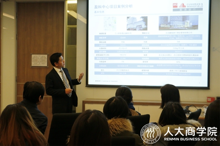 随后,师生一行赴戴德梁行北京办公区国贸嘉里中心进行参观。戴德梁行高级董事胡峰先生以“盈科中心商业改写字楼项目案例分享”为主题做了精彩演讲。胡峰先生首先阐述了当前北上广深等一线城市对老建筑更新改造与运营的升级需求,并分享了戴德梁行的发展历史、主营业务以及作为房地产整体运营管理的服务公司和顾问公司的业务结构,重点介绍了戴德梁行参与的房地产评估项目。基于国内的房地产开发运营市场,胡峰先生讲述了房地产发展的三个阶段——快速建设时期、产权变动时期和资产证券化时期。他认为,未来开发商持有并运营核心物业资产是重要盈利方向,房地产金融是未来房地产的发展大势,资产评估行业大有前途。